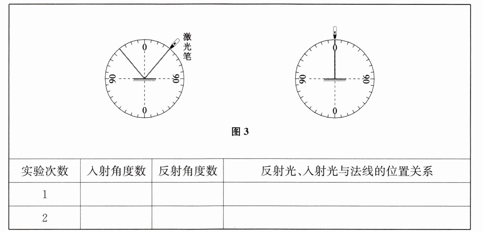 3. 图3所示是小玲用光具盘研究光的反射时所做的两次实验,请将实验数据记录在下表中.