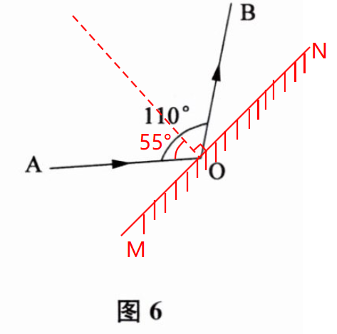 9. 根据图6中已给的入射光线和反射光线,画出镜面$MN$,并标出入射角及大小.