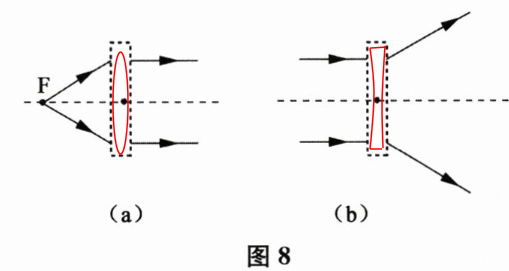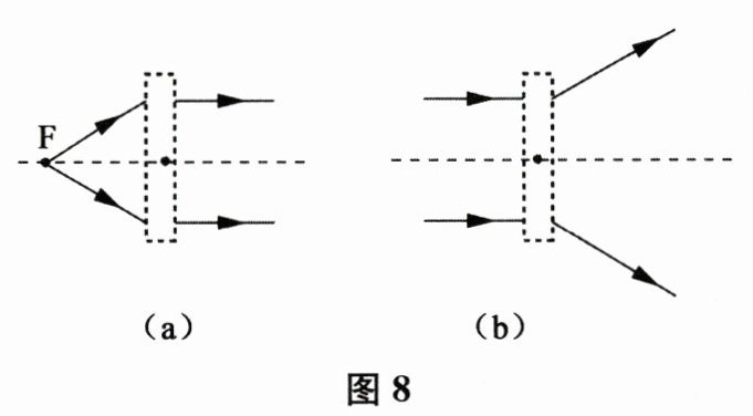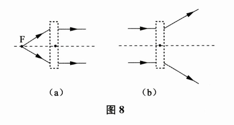 20. 在图 8(a)、(b)中,画出了光通过透镜前后的方向,请在虚线框中填上适当的透镜。