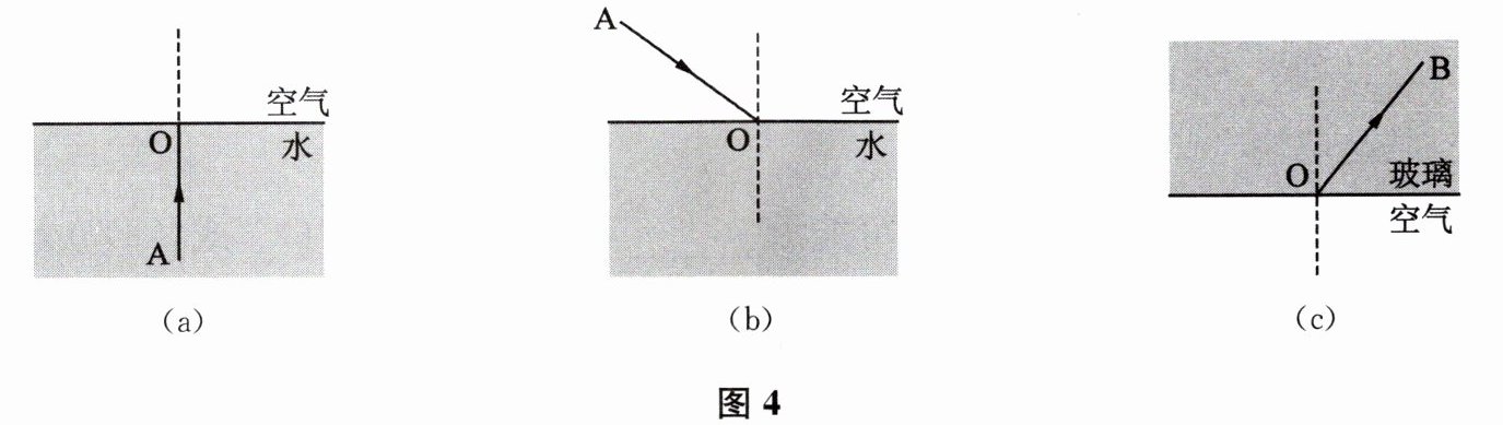8. 请在图4(a)、(b)、(c)中分别画出所给光线的折射光线OB或入射光线AO的大致位置.