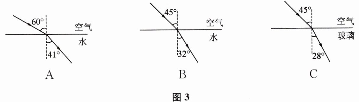 8. 某同学在研究折射角与入射角的大小关系时,根据实验现象画出了如图3所示的三幅图.