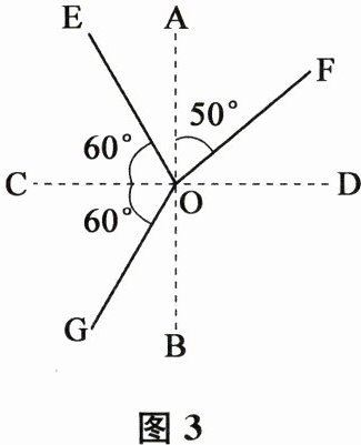 在图中,$\angle EOC = \angle FOC = 60^{\circ}$,所以$EO$和$FO$关于法线对称,则$CD$为法线,$AB$为界面。