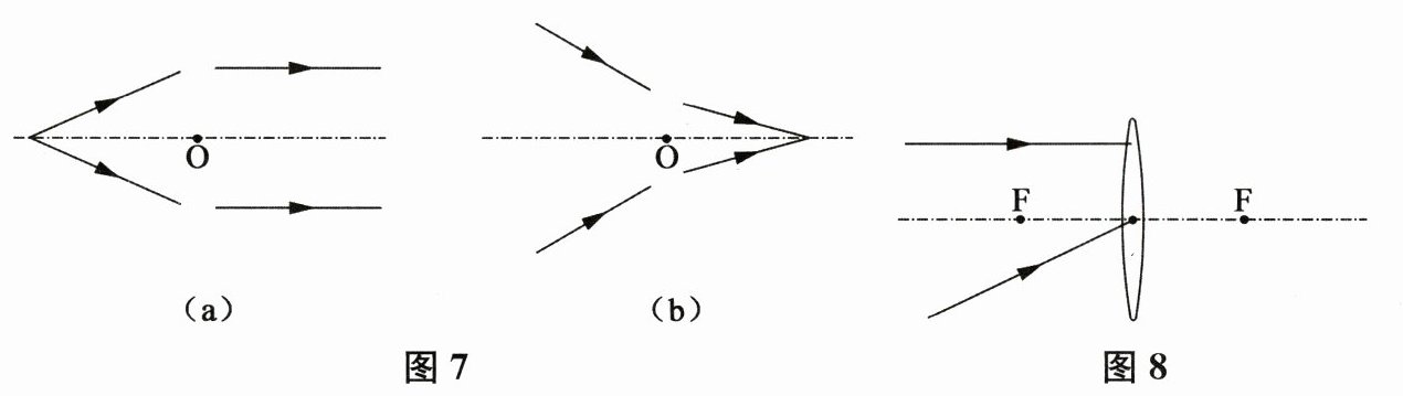 22. 在图 8 中,根据给出的入射光线,分别画出通过透镜后相应的折射光线。