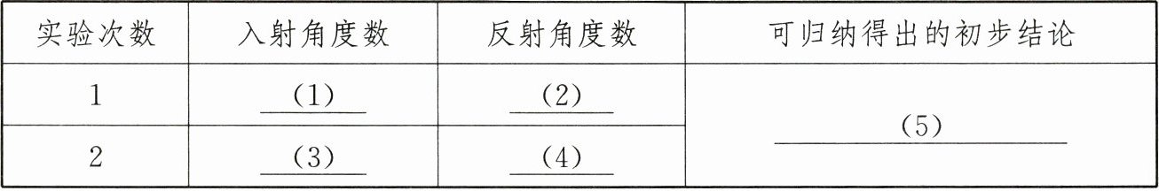 |实验次数|入射角度数|反射角度数|可归纳得出的初步结论|