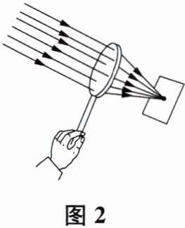 3. 如图2所示,小丽同学将一块凸透镜正对太阳光,再把一张纸放在它的另一侧,改变透镜与纸的距离,直到纸上出现一个最小、最亮的光点,这个光点就是凸透镜的