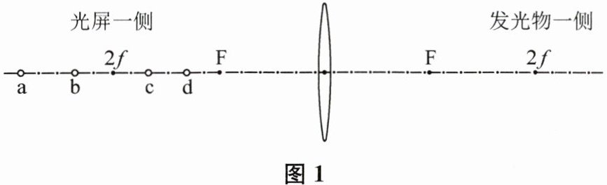 (1)凸透镜成实像时都是倒立的,当物距大于焦距时,成倒立的实像,所以光屏在$a$、$b$、$c$、$d$点处都能找到倒立的像。