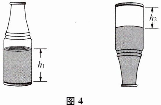 他先用刻度尺测出瓶底直径为 $ d $,在瓶中倒入适量的水,测出瓶中水面距瓶底的距离为 $ h_1 $. 然后再堵住瓶口,将瓶竖直倒置后测出水面距瓶底的距离为 $ h_2 $,如图 4 所示.