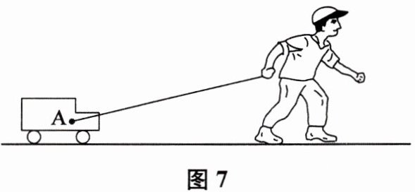 10. 如图7所示,工人用斜向上的力拉着小车向右运动,拉力大小为$100N$,用力的图示法画出这个拉力(作用点在$A$点)。
