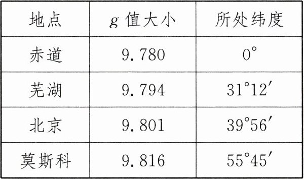 |地点|g值大小|所处纬度|地点|g值大小|所处纬度|