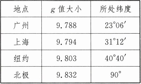 例如,赤道处纬度为$0^{\circ}$,$g$值为$9.780\ N/kg$;北极处纬度为$90^{\circ}$,$g$值为$9.832\ N/kg$。