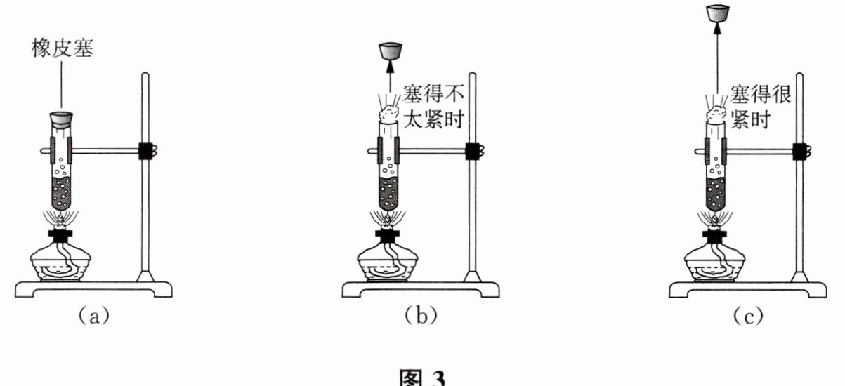 1. 如图3所示,某小组同学探究水蒸气对外做功时的情况,他们在试管中加入适量水,用橡皮塞塞住试管口后,用酒精灯给试管中的水加热[如图(a)所示],当水沸腾后继续加热,管内水蒸气会在某一时刻把橡皮塞突然弹起[如图(b)所示]。小组同学适当改变橡皮塞的塞紧程度,发现若塞得更紧一些,水蒸气把橡皮塞弹起所需的时间会更长一些,橡皮塞被弹起的高度更高一些[如图(c)]。