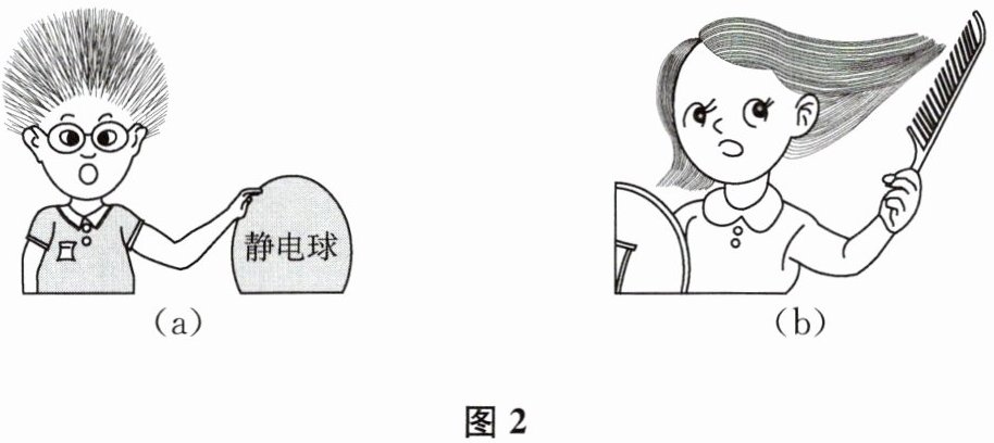 5. 在上海科技馆有一个奇妙的球体,用手触摸时,人的头发会直竖起来,如图2(a)所示.冬季使用塑料梳子时,干燥的头发会随梳飘舞,如图2(b)所示.上述现象都属于