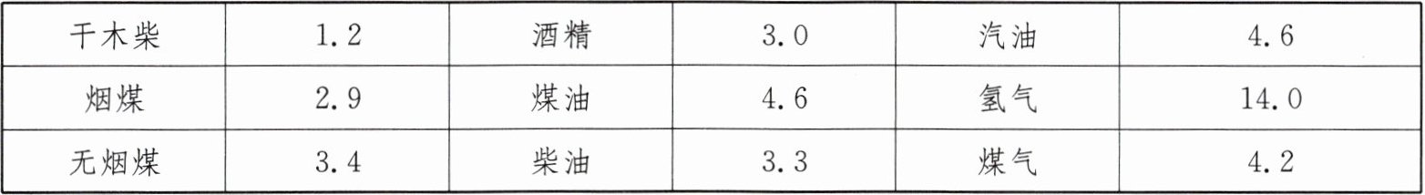 |烟煤|2.9|煤油|4.6|氢气|14.0|