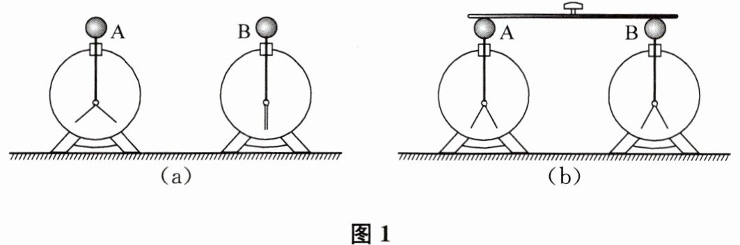 1. 取两个验电器A、B,使A带上负电荷,B不带电[如图1(a)所示]。用一根带绝缘柄的金属棒把A、B两个连接起来[如图1(b)所示],会看到A的金属箔张开的角度