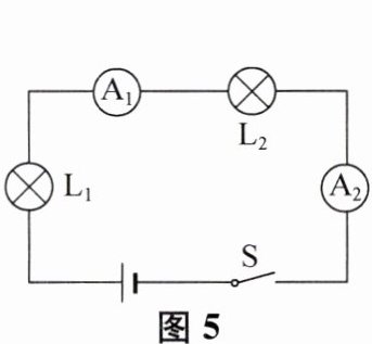 1. 在做“用电流表测电流”的实验中,小王同学连接了如图5所示的电路,当他闭合开关S时,发现两个电流表均有示数,但$A_{1}指针的偏转角度明显要比A_{2}$指针的偏转角度大.于是他猜想:当电流通过灯泡时,由于灯泡要消耗电能,所以电流通过每个灯泡后都会逐渐减小.