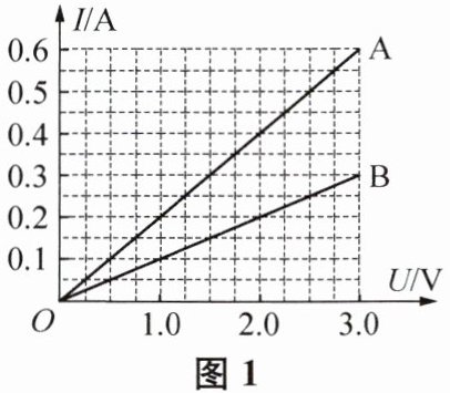 4. 两个导体 A 和 B 中的电流与其两端电压的关系如图 1 所示,由图可知,导体 A 的电阻为$R_{A}=$