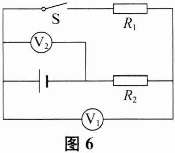 1. 如图6所示电路中,电源电压保持不变,两个电压表均为实验室常用的学生电表.当闭合开关$S$后,发现两个电压表的指针偏离“0”刻度线的角度完全相同,则$R_{1}:R_{2}$等于