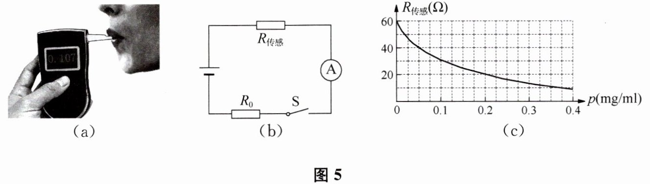 9. 如图5(a)所示为某型呼气式酒精测试仪,其工作电路如图5(b)所示,电源电压恒为$4.5V$,定值电阻$R_{0}的阻值为15\Omega$,$R_{传感}$是酒精气体传感器,它相当于一个电阻,但它的阻值会随酒精气体浓度$\rho$的变化而变化,如图5(c)所示.若酒驾标准为$\rho\geqslant0.2mg/ml$,某次检测时电流表的示数为$0.1A$.