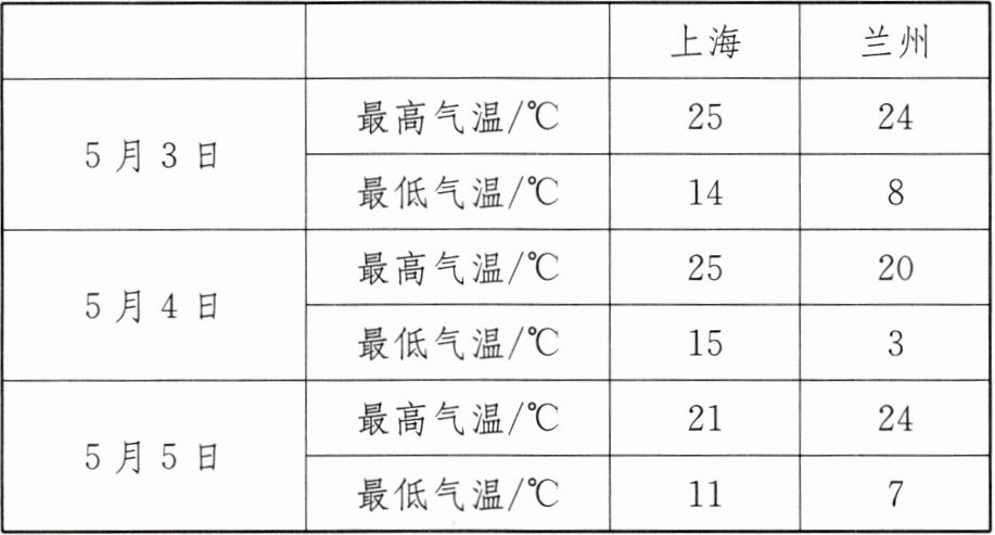 1. 上海为沿海地区,兰州为内陆地区,下表为上海和兰州两地某年5月3日到5月5日三天,白天的最高气温和夜晚的最低气温值.