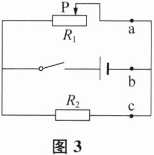 4. 在图3所示的电路中,电源电压不变.若将电流表$A_1、$$A_2$分别串接在电路a、b或c三点中的某两点处,闭合开关、将滑动变阻器滑片P向右移动时,发现$A_1$和$A_2$示数的比值增大.则以下连接不可能的是 (