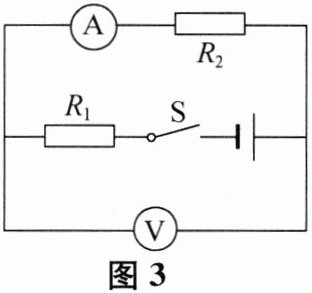12. 如图3所示电路,电源电压为$6V$,$R_{1} = 20\Omega$. 当闭合开关时,电压表$V的示数为2V$. 求: