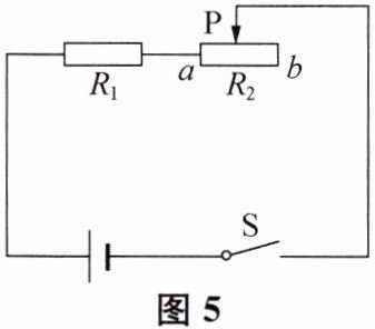 2. 如图5所示电路中,电源电压不变,定值电阻$R_{1}的阻值与滑动变阻器R_{2}的最大阻值的关系为R_{2} = 2R_{1}$. 当开关$S$闭合、滑动变阻器的滑片$P由a端向b$端滑动时,下列说法中正确的是 (