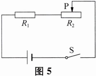 2. 在图 5 所示的电路中,电源电压 12 V 保持不变,定值电阻 $ R_1 $ 的阻值为 10 Ω,滑动变阻器 $ R_2 $ 的最大阻值为 20 Ω. 闭合开关 $ S $ 后,当滑片 $ P $ 自中点位置向左移动时,$ R_2 $ 消耗的电功率