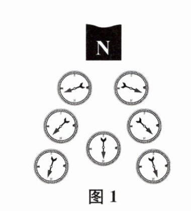 3. 如图1所示,在一根条形磁体的N极附近放若干能自由旋转的小磁针,当这些小磁针最后静止时,发现每个小磁针的指向