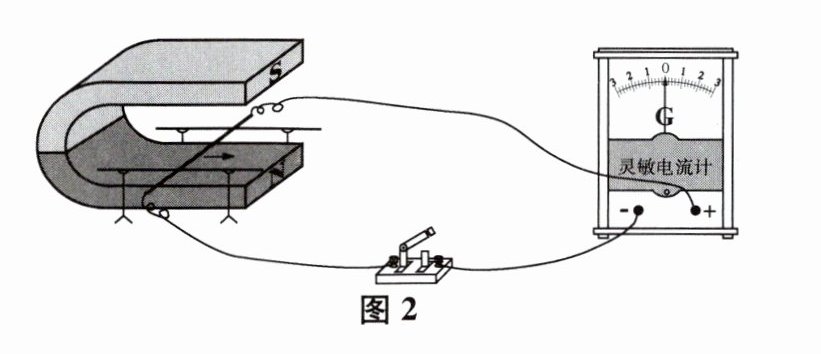 3. 利用磁场产生电流的条件是什么呢?如图2所示,在U形磁铁旁放一个绝缘支架,将一根细铜棒搁在支架的水平导轨上,用导线将铜棒和开关、灵敏电流计(能测量出较小电流的电流表)相连,闭合开关后,拉动铜棒沿导轨向右快速移动.