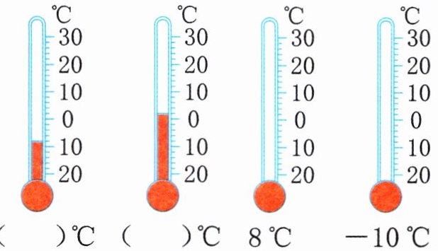 答案:$-20$;$10$;图略(右边第一支温度计液柱画到$8$刻度处,右边第二支温度计液柱画到$-10$刻度处)