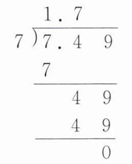 $\begin{array}{r}1.7\\7\enclose{longdiv}{7.49}\\7\\\hline49\\49\\\hline0\end{array} $