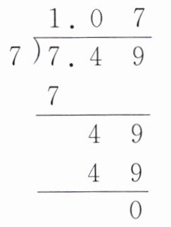 $\begin{array}{r}1.07\\7\enclose{longdiv}{7.49}\\7\\\hline49\\49\\\hline0\end{array}$