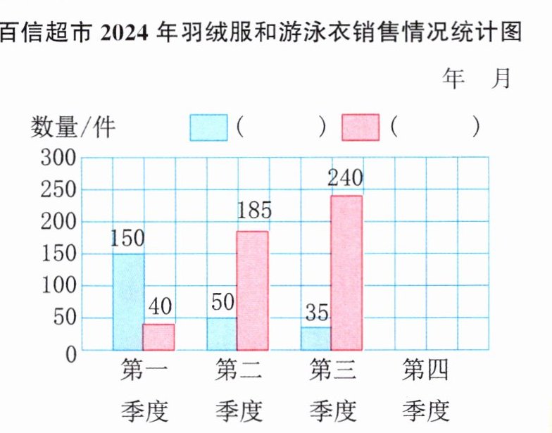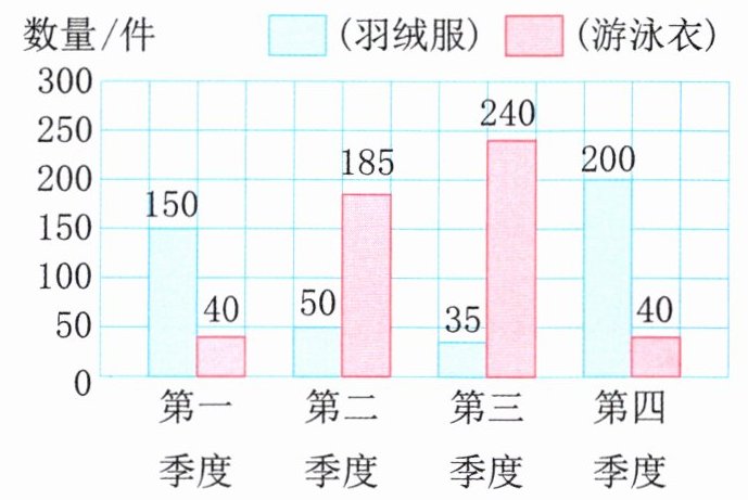 答案:羽绒服200件,游泳衣40件;图略(在第四季度对应羽绒服的直条画到200的位置,游泳衣的直条画到40的位置 )。