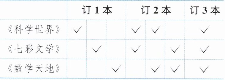 不同的订阅方法。点评苑:先在表格中列举出几种可能的情况,再按顺序将各种情况下所有的可能用画“√”的方法表示出来,条理清晰。