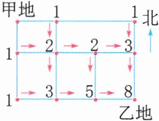 例题2 如图,从甲地到乙地只允许往南和往东走,不能走重复路线,那么从甲地到乙地一共有多少种不同的路线可走?