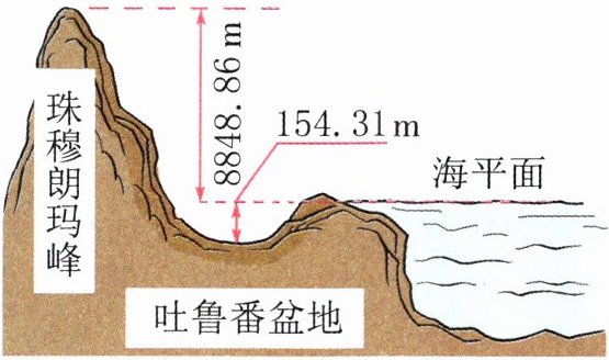 [教材第2页例2] 你能看图说出珠穆朗玛峰和吐鲁番盆地比海平面高或低多少米吗?