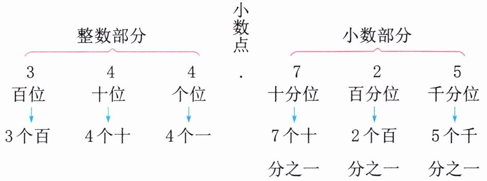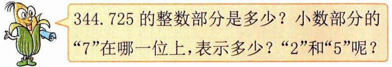 344.725的整数部分是344;小数部分的“7”在十分位上,表示7个十分之一(0.1),“2”在百分位上,表示2个百分之一(0.01),“5”在千分位上,表示5个千分之一(0.001)。