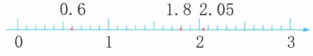 答案:图略(在数轴上从$0$往右数第$6$个点处标$0.6$;从$1$往右数第$8$个点处标$1.8$;在$2.0$和$2.1$中间位置标$2.05$ )。
