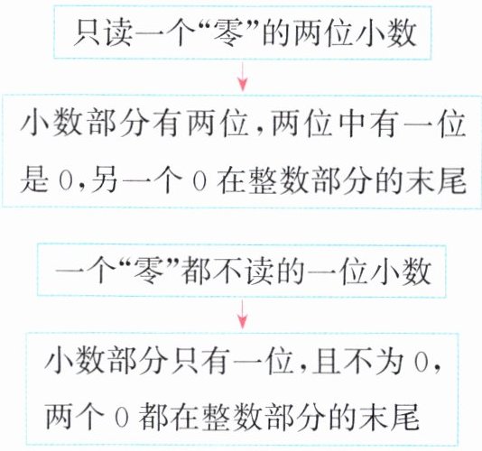 对于只读一个“零”的两位小数,因为小数部分有两位,要使其只读一个零,那么两位中有一位是 0,另一个 0 在整数部分的末尾;