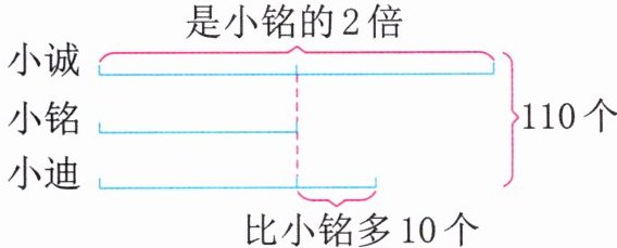 例题4 小诚、小铭、小迪三人一起包了110个饺子,小诚包的饺子数是小铭的2倍,小迪比小铭多包10个。三人各包了多少个饺子?