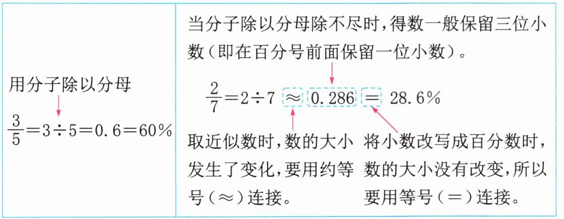 把分数改写成百分数时要注意:先把分数改写成小数(分子除以分母),再把小数改写成百分数;当分子除以分母除不尽时,得数一般保留三位小数(即在百分号前面保留一位小数),取近似数时用约等号连接,将小数改写成百分数时用等号连接。