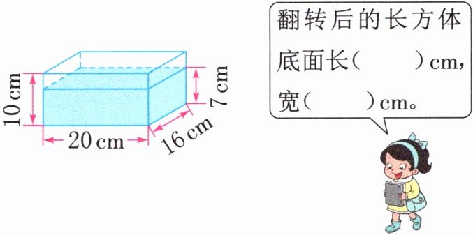 1. 如图是一个长方体密闭容器,从里面量长 20 cm,宽 16 cm,高 10 cm,平放时水深 7 cm。若向右翻转竖起来,则这时密闭容器中水深多少厘米?