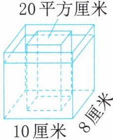 思路导引:水槽中水的体积在放入铁棒后没有发生变化,仍是 $10×8×6 = 480$ (立方厘米)。由于放入的铁棒占了部分底面积,使底面积减少为 $10×8 - 20 = 60$ (平方厘米)。这时,水的形状变成了一个中间被挖去一个小长方体的中空的长方体,可以画出如下示意图: