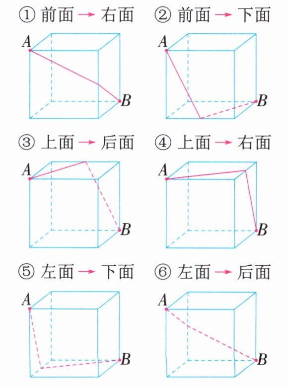 答案:从点$A$到点$B$的最短路线有$6$条,分别为:前面$\to$右面;前面$\to$下面;上面$\to$后面;上面$\to$右面;左面$\to$下面;左面$\to$后面。