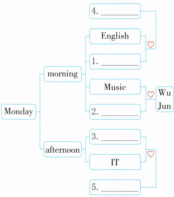 Li Na:We have English, Chinese, Music and Maths in the morning. And we have IT and Science in the afternoon.