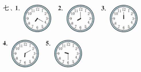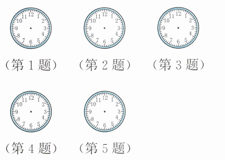 七、[跨学科]根据提示,在下面的钟面上画出正确的时间。(每小题1分,共5分)