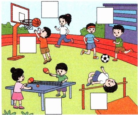 五、大课间活动,刘涛和朋友们在操场上锻炼身体。他们分别喜欢什么运动呢?请听一听刘涛的介绍,根据他介绍的顺序,在图中相应运动旁的方框内标上序号。(听两遍)(共10分)