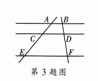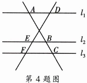 4. 如图,已知直线$l_{1}// l_{2}// l_{3}$,另两条直线分别交$l_{1}$、$l_{2}$、$l_{3}$于点A、B、C及点D、E、F,且$AB= 3,DE= 4,EF= 2$,则 (
