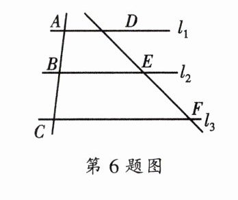 已知直线$l_{1}// l_{2}// l_{3}$,直线$AD$、$BC$分别交$l_{1}$、$l_{2}$、$l_{3}$于点$A$、$B$、$C$及点$D$、$E$、$F$,则可得$\frac{AB}{BC}=\frac{DE}{EF}$。