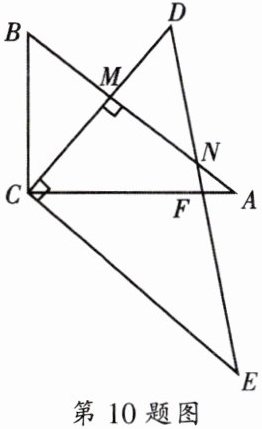 10. 如图,在$\triangle ABC与\triangle DCE$中,已知$∠ACB= 90^{\circ },∠DCE= 90^{\circ }$,且$DC⊥AB,DC$、DE分别交AB于点M、N.当$\frac {DN}{BC}= \frac {MN}{CM},DE= 10$时, 求CF的长.